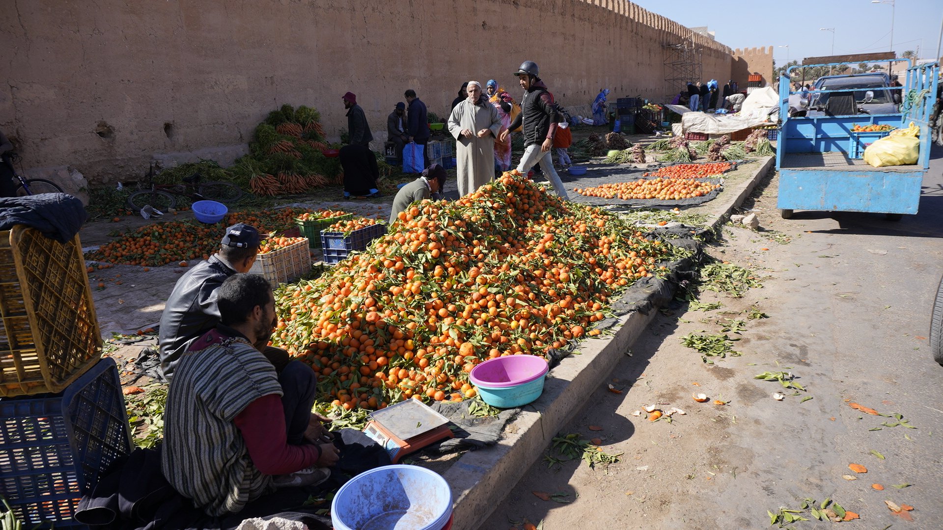 Po raz pierwszy jesteśmy wypoczęci i wyspani. Rano zapytaliśmy właściciela hotelu, o najbliższy sklep w którym można kupić kartę pamięci. Pan wykonał jeden telefon i w ciągu 15 minut pojawił się właściciel sklepu z zamówioną kartą. Przedpołudnie spędziliśmy na zwiedzaniu starej Mediny w Tiznicie, ogrodzonej wysokim, warownym murem. Tam też zjedliśmy śniadanie i wypiliśmy pyszną kawę w barze, do którego turyści raczej nie zaglądają.😜 Oglądaliśmy też sklepy oferujace srebrną i złotą biżuterię. W końcu dotarliśmy do najstarszej dzielnicy miasta, w której znajduje się targ owocowo-warzywny. Po raz pierwszy w życiu widzieliśmy ogromne kopce mandarynek i innych cytrusów, usypane na ziemi. Potem już tylko droga do Agadiru urozmaicona mandatem za przekroczenie prędkości (400DH). Agadir przywitał nas ogromnymi korkami i już przy wjeździe wiedzieliśmy, że to nie jest miejsce dla nas. Ogromne, luksusowe hotele, mnóstwo turystów, długie plaże-nuda. Typowy kurort, jak w każdym ciepłym kraju. Po godzinnym spacerze i zakupach wróciliśmy do hotelu. Zatęskniliśmy za tym co było wcześniej. Za tą dzikością, kolorami i zapachami Maroka, za życzliwymi Muzułmanami, brakiem naciągaczy, za przestrzenią, za tradycyjnym marokańskim jedzeniem, a nawet za nie do końca komfortowymi hotelami. Takie Maroko pokochalismy. Agadir to oklepany kurort dla ludzi bez wyobraźni i ciężko by było tu wytrzymać dłużej niż jeden dzień. Jedyny malutki plusik Agadiru, to możliwość zakupu alkoholu.😉